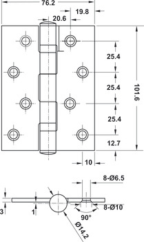 Bản lề lá 489.05.021 , 2 vòng bi, KT 102 x 76 x 3 mm, lớp phủ inox sa tanh
