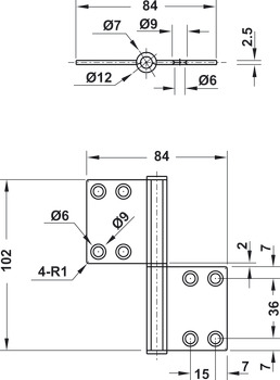 Bản lề lá 926.60.900, Bản lề nâng hạ , inox 304, KT 102 x 84 x 2,5 mm, lớp phủ inox sa tanh