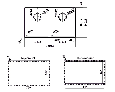- Kích thước bồn: 340 x 400R mm/ 340 x 400R mm