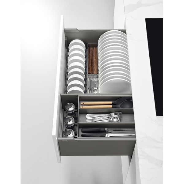 Kệ được chia thành nhiều ngăn riêng biệt, phù hợp để lưu trữ đĩa, bát, chén, muỗng, đũa, dao kéo và vật dụng nhà bếp khác. Mỗi ngăn đều có cấu trúc tối ưu giúp cố định dụng cụ chắc chắn, tránh va đập khi đóng mở ngăn kéo.