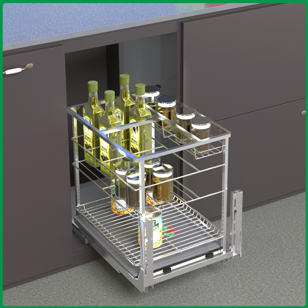 Ngoài những chiếc giá để xoong nồi chiếm một khoảng lớn ở trong không gian tủ thì những kệ đựng gia vị, cũng được thiết kế nhỏ gọn nằm ngay ngắn ở bên cạnh. Tuy có kích thước bé nhưng đây là kệ gia vị tủ bếp dưới có rất nhiều hữu ích. Giúp cho việc sắp xếp các chỗ được dao thớt, gia vị ngay ngắn và hợp lý hơn. Từ đó mà không gian bếp cũng ngăn nắp và không bị lộn xộn.
