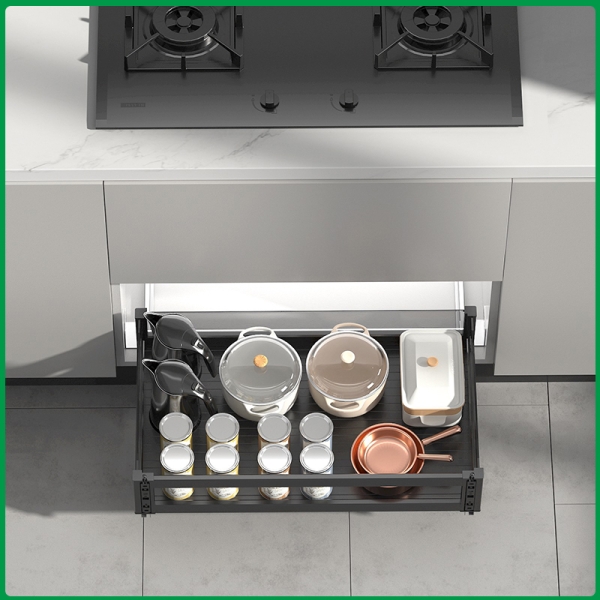 - Tích hợp nhiều tầng kệ, phù hợp để lưu trữ xoong, nồi chảo và các vật dụng khác.