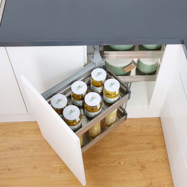 Góc chết trong gian bếp được xem là nơi tích trữ rất nhiều bụi bẩn vì không thể sử dụng được. Kệ góc liên hoàn inox hộp là một giải pháp hữu ích mà bạn đang cần. Với thiết kế 2 dạng mở cánh trái và cánh phải cùng với hệ thống ray trượt gấp khúc thông minh giúp tăng diện tích lưu trữ cho căn bếp thêm tiện nghi, sang trọng.