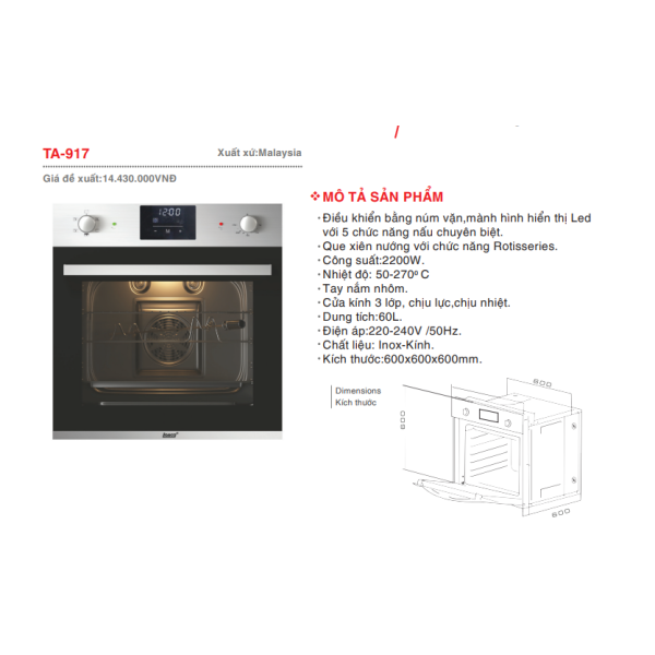 “Mẫu lò nướng Lorca TA 917 có kích thước tiêu chuẩn và dung tích 60 lít, sản phẩm có dung tích lớn. Đây là sự lựa chọn hoàn hảo cho gia đình đông người, đáp ứng cho việc nấu nướng nhiều món ăn cùng một lúc.”
