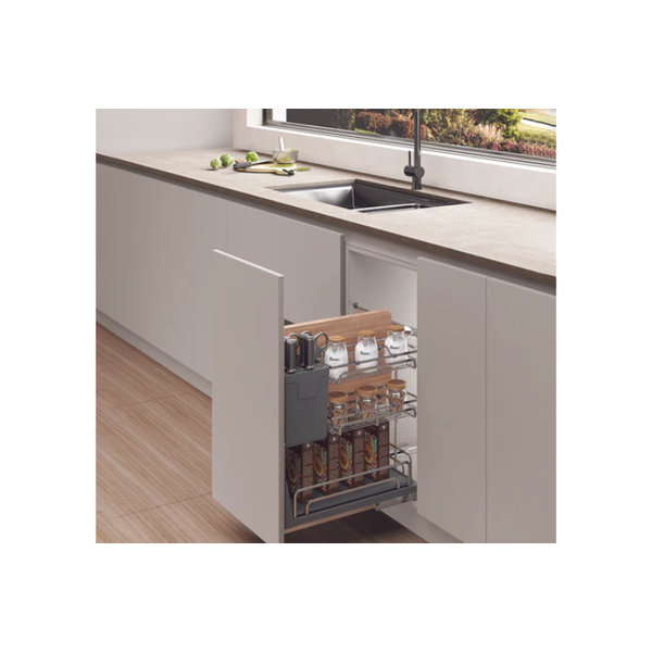 | Thiết kế công năng đa dạng để lưu trữ đồng thời gia vị, dao, thớt, đũa, thìa. Khay lưu trữ dễ dàng tháo rời để vệ sinh. |