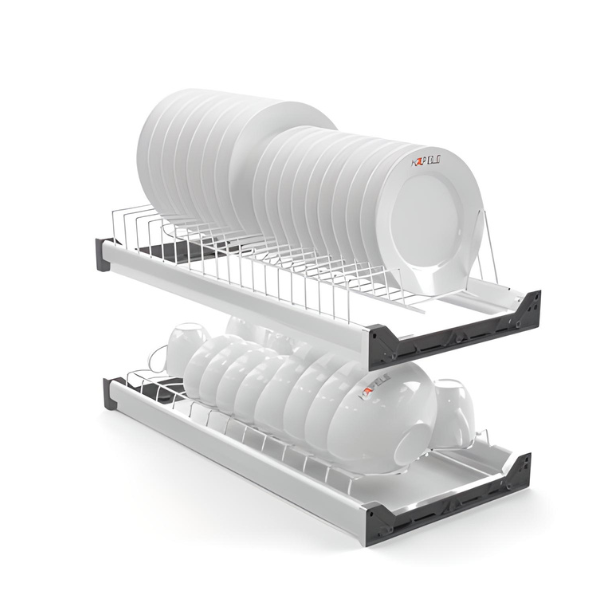 Trọn bộ sản phẩm Rổ chén đĩa cố định Kosmo bao gồm Khay úp đĩa, khay úp chén, khay hứng nước, bộ ốc vít lắp đặt
