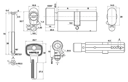 Ruột khóa cửa phòng Hafele 489.56.003, size 32.5 / 32.5 mm, màu niken mờ