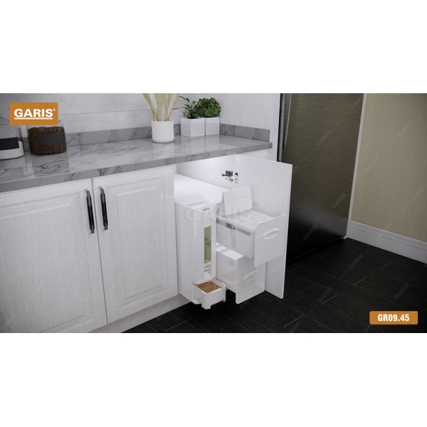 Đặc điểm: lấy gạo mặt trước, bắt đáy hoặc vách tủ, 3 khoang, khoang 10kg có thêm ray bi