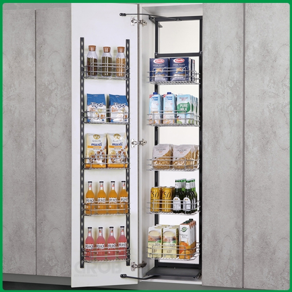 Kệ đồ khô 4,6 tầng dạng nan GRÖß: là phụ kiện tủ bếp dưới, được làm từ thép mạ crom. Với thiết kế 4 tầng đẹp mắt, cánh mở trái hoặc phải, dễ tháo rời nên dễ lau chùi.
